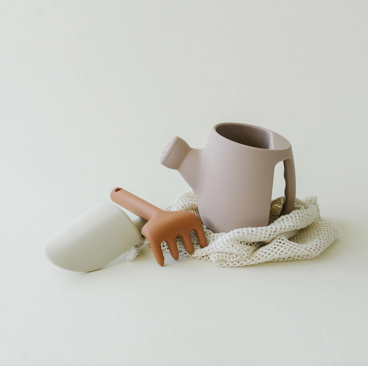 Marlowe & Co's Silicone gardening sets are designed for creative play and can be used in the sand, garden, water or your child's play kitchen!! Made from 100% food grade silicone and available in 3 colors: Botanical Rose, Terracotta, and Dried Thyme. They are BPA, phthalate free, lead free, and third party CPSC tested to ensure the highest quality and safety for your little one. What's Included: 1 watering can, 1 shovel, 1 rake, 1 mesh carrying bag.